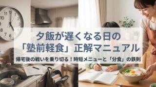 塾前軽食 夕飯が遅くなる日の塾前軽食の正解はコレ!夕飯が遅い日の時短メニューとNGな食べ物 夕飯が遅くなる日の塾前ご飯に悩む共働きママへ。帰宅後のドカ食いを防ぐ「分食」のやり方や、市販のおでん、圧力鍋で作る里芋スープなど5分〜15分で完成する超時短メニューを紹介。子どもの学習を応援します。 2026.03.01 塾前軽食夕飯に響かせない塾前軽食